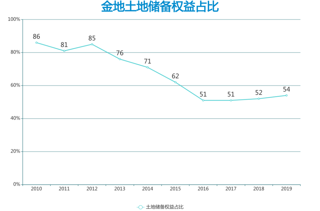 但在2015年至2019年,金地新增土地储备权益比没有一年超过50%。