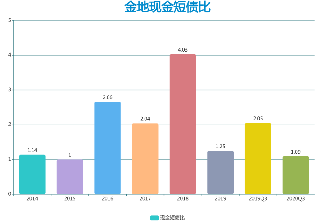 最新数据显示,截至2020年三季度,金地现金短债比为1.09倍,恰好满足监管要求。而在2019年同期,这一数值为2.05倍。