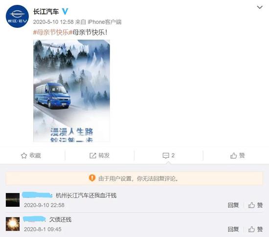 长江汽车的官方微博,动态停留在2020年5月节日海报,仅有的评论则是“还我血汗钱”“欠债还钱”。
