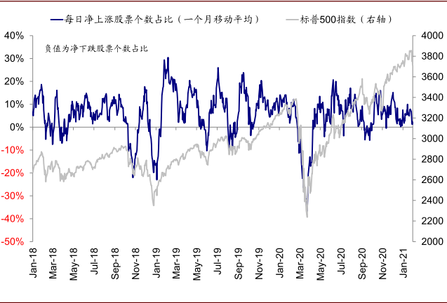 ii. 上涨下跌家数占比:衡量市场表现集中度,过高时表明整体情绪亢奋;两者背离时,如指数上涨但比例下降则表明指数为较少个股驱动,去年12月以来即是如此。