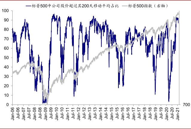 图表: 200天均线以上个股占比,当前标普500指数为86.8%,从12月底的92%略有回落,但仍处高位