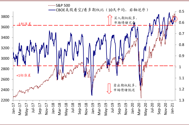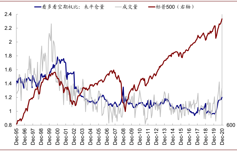 ii. 期权未平仓量:通过期权也可以实现加杠杆的目的,2020年下半年以来,芝加哥商品交易所(CBOE)所有未平仓的看多期权(Call Option)量激增至212万份,较上半年大幅增长30%,也使得多空未平仓量比例升至2008年以来的高位。