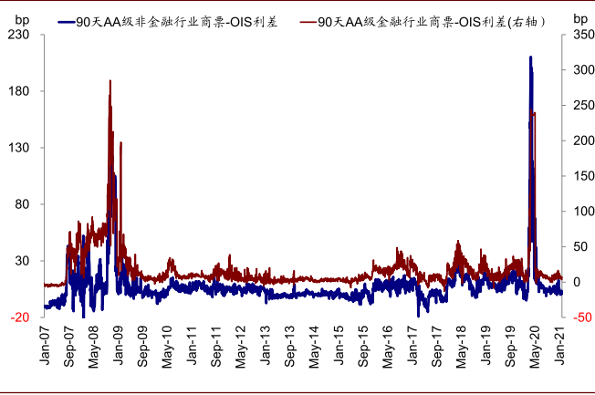 图表: 商业票据利差目前也处于历史低位,表明企业融资市场流动性也依然充裕