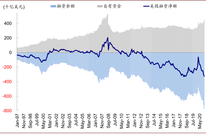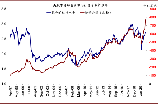 i. 融资余额与隐含杠杆:通过券商融资买入(buying on margin)规模需要定期披露,这一加杠杆方式可以近似看作以个人投资者为主。截止12月的最新数据显示,融资余额超过7780亿美元的历史高点,占美股总市值的1.1%;不过由于自有资金规模在同样增加,因此隐含的杠杆水平为2.72,低于2018年中接近3倍杠杆的高点。