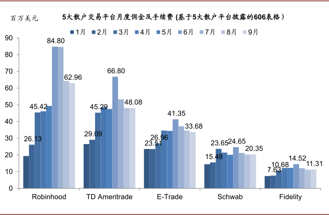图表: 我们汇总美国5家最大也是个人投资最为常用的平台,如Robinhood、TD Ameritrade等,发现其交易佣金在6月达到最高点