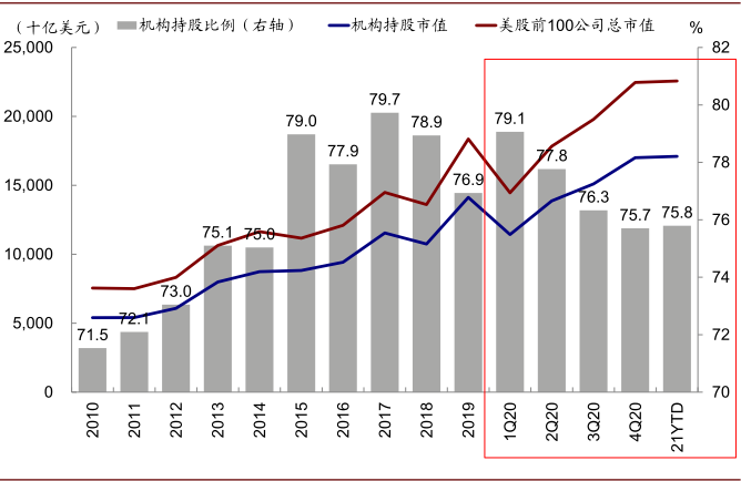 图表: 美股前100大个股的机构持股比例看,机构持股2020年以来持续回落,从79%将至75.8%左右