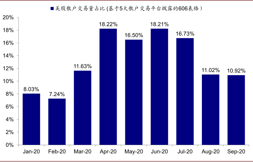 图表: 且通过这5家平台的交易量占美股总成交也持续攀升,二季度一度高达18.2%,三季度有所回落