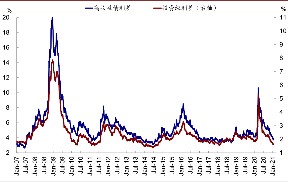 图表: 投资级和高收益债的信用利差衡量长期企业的融资成本,在流动性紧张或者信用市场受到冲击时也会快速走高,2020年3月份即是如此