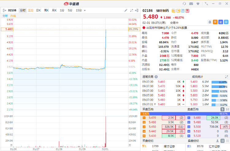 绿叶制药(2186.HK)大涨40.87%报5.48港元,最新总市值178亿港元。