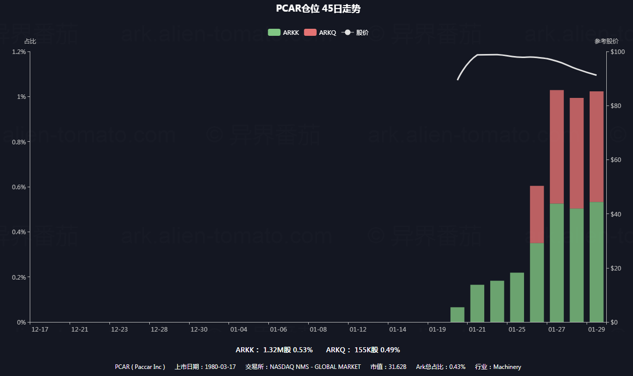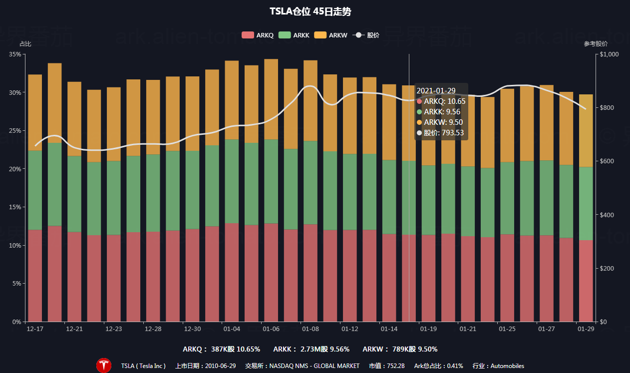 近45日,ARK旗下基金在特斯拉(TSLA)的仓位,如下图所示:
