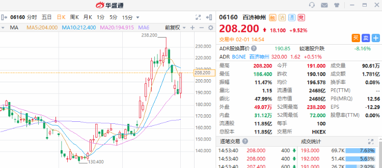 百济神州午后涨幅扩大至9.52%,报208.2港元,总市值2468亿港元。