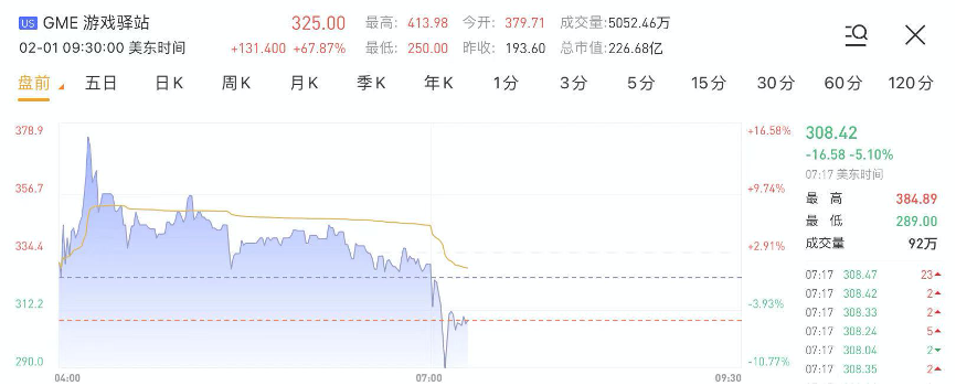 华盛资讯2月1日讯,游戏驿站(GME)盘前转跌,一度跌超10%!截至发稿,游戏驿站盘前跌5.10%,报308.42美元。