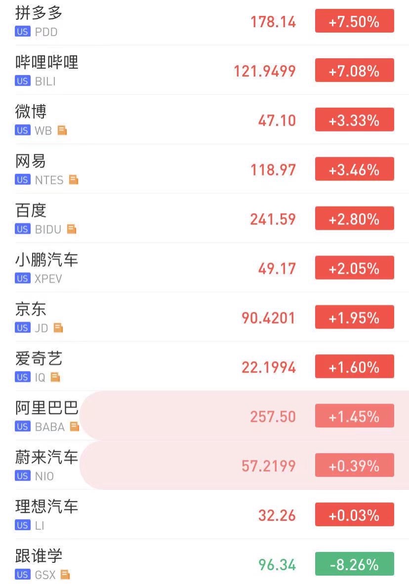 截止发稿,拼多多、哔哩哔哩涨超7%,微博网易涨超3%,百度、小鹏涨超2%,京东、爱奇艺、阿里涨超1%。