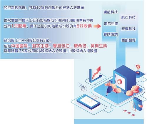 记者获悉,经过新规筛选,共有12家科创板公司被纳入沪港通。此次调整中属于上证180指数成份股的科创板股票有中微公司1只股票,属于上证380指数成份股的有澜起科技、海尔生物、睿创微纳、杭可科技、安集科技和西部超导6只股票。科创板上市A+H股公司有5家,包括中国通号、君实生物、复旦张江、康希诺、昊海生科。这意味着这5家公司的A股将纳入沪股通,H股将纳入港股通。