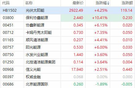 华盛资讯2月2日消息,光伏板块早盘涨幅居前。截至发稿,保利协鑫能源(03800)涨超10%,卡姆丹克太阳能(00712)涨超7%,协鑫新能源(00451)涨超6%,阳光能源(00757)涨6%。