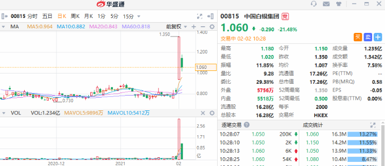 白银概念股全线回吐,截至发稿,中国白银集团(00815)跌21.48%,报1.06港元;金猫银猫(01815)跌19.19%,报0.8港元。