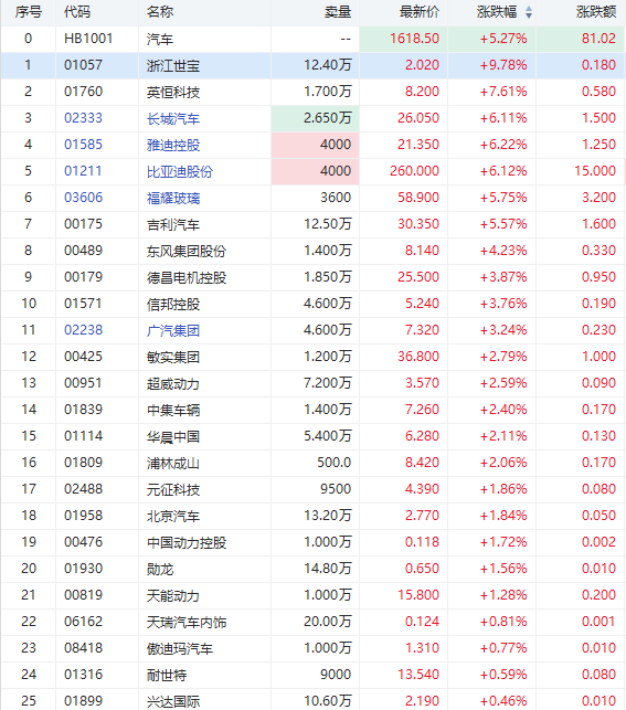 华盛资讯2月2日消息,汽车股今日持续反弹回升,盘中涨幅扩大逾5%。截至发稿,浙江世宝涨9.78%,雅迪控股涨6.22%,比亚迪股份涨6.12%,长城汽车涨6.11%,吉利汽车涨5.57%,广汽集团涨3.24%。