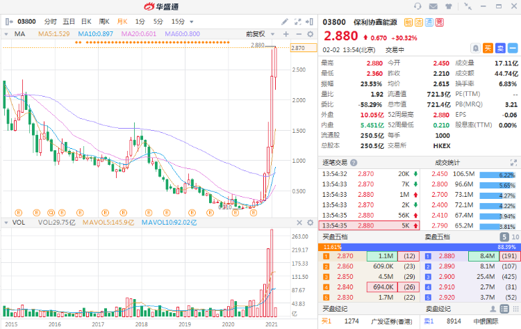 保利协鑫能源(03800)涨幅扩大至30%,截至发稿,涨30.32%,报2.88港元,成交额44.74亿港元。