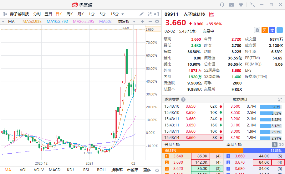 华盛资讯2月2日消息,赤子城科技今日强势反弹,盘中大涨35%,回补四日跌幅且逼近历史新高。截至发稿,赤子城涨35.56%,现报3.66港元每股,成交额达2.12亿,当前总市值为36.55亿港元。