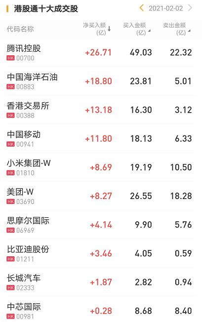 个股方面,今日南下资金净买入腾讯控股26.71亿港元,连续多日为买入之最。此外,南下资金净买入中国海洋石油18.8亿港元,净买入香港交易所13.18亿港元。
