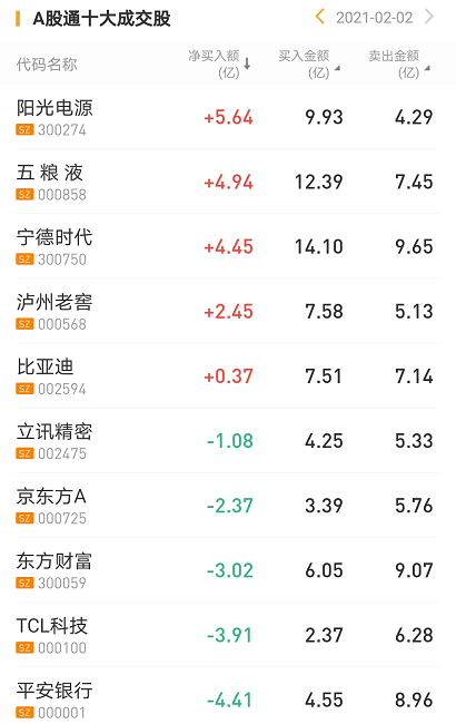 北上资金今日净买入阳光电源5.64亿元,为今日买入之最。此外,北上资金今日净买入五粮液4.94亿元。