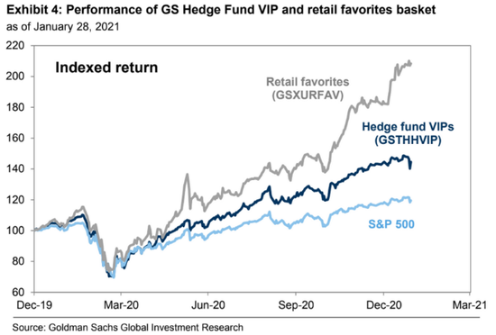 自2020年3月市场跌至低点以来,高盛跟踪的最受散户青睐的一篮子股票的表现同时碾压了大盘和对冲基金。