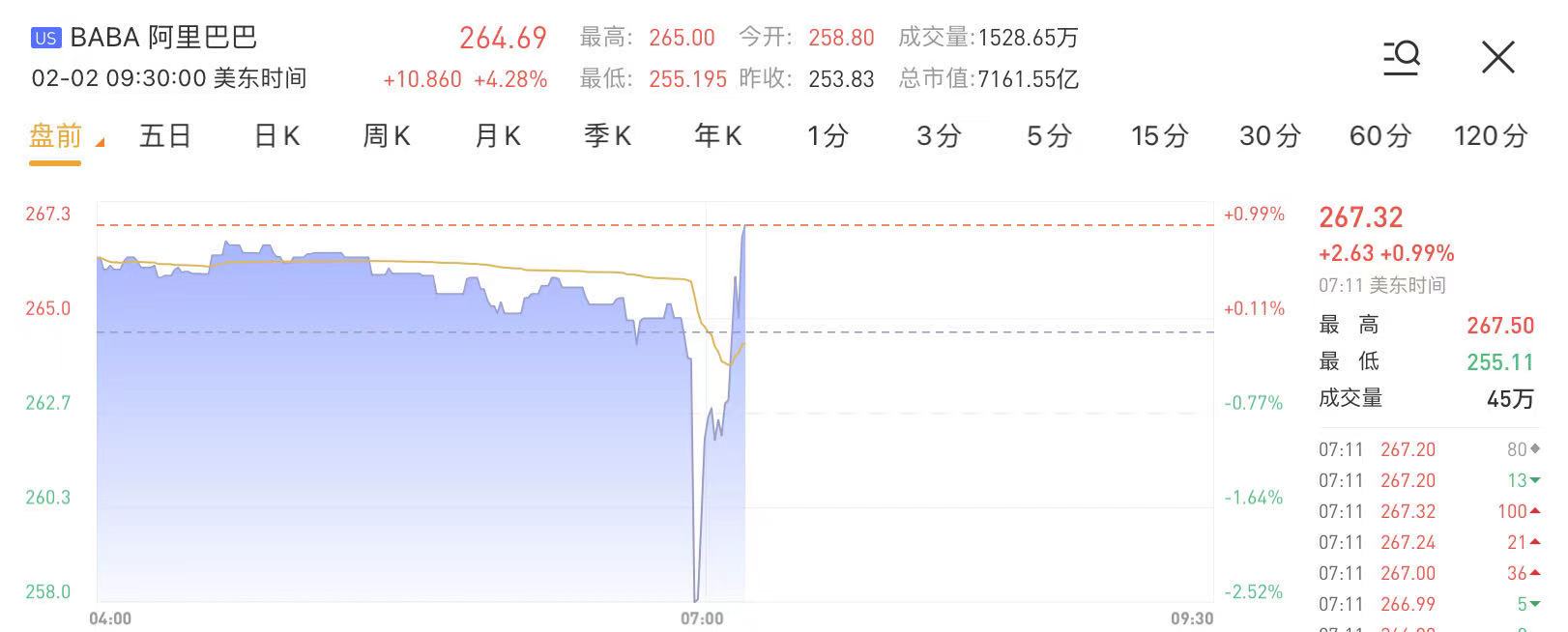 消息发布后,阿里巴巴(BABA)盘前转涨,现近1%。
