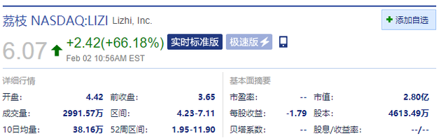 新浪科技讯 2月2日晚间消息,美股早盘,荔枝盘中一度大涨90%,截止发稿涨幅收窄至66.18%,报6.07美元,该股昨日收涨10.61%。