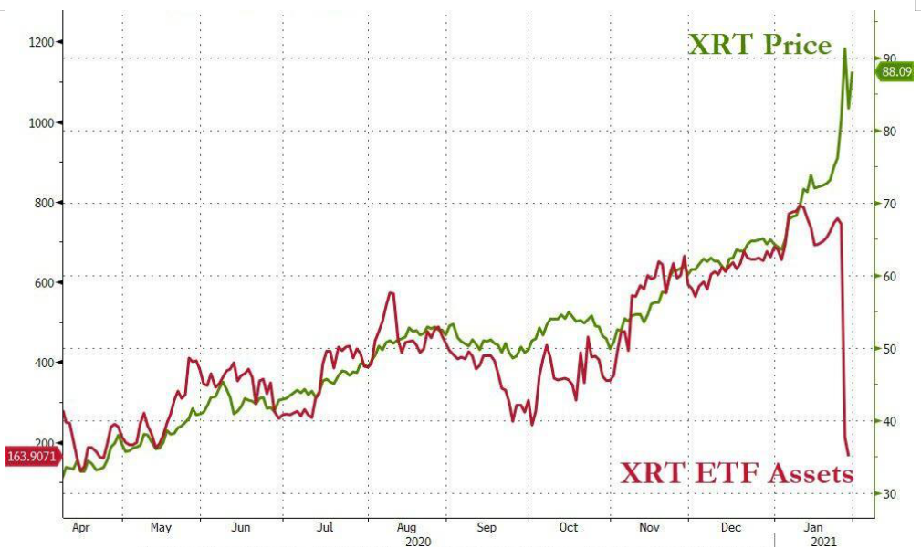 不过去杠杆化其实是一个好消息。在一些对冲基金遭受惨重损失之后,一些杠杆化程度较高的行业纷纷去杠杆化,当时,一些对冲基金甚至在标普零售业 ETF(XRT)中大量增加GME的份额,导致XRT价格大幅上涨的同时,资产规模出现大幅下跌。