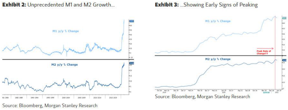 第二,自去年11月首批疫苗宣布以来,金融体系的杠杆率一直在上升。年初时,对冲基金的总杠杆率为1%。与此同时,多头基金的现金余额接近历史低点。散户投资者的买入活动从未像现在这样活跃过,他们的保证金债务也非常高,即使M1和M2增长率可能大幅下降,股市的流动性也很难进一步走高,而且即使走高也很容易就会逆转。