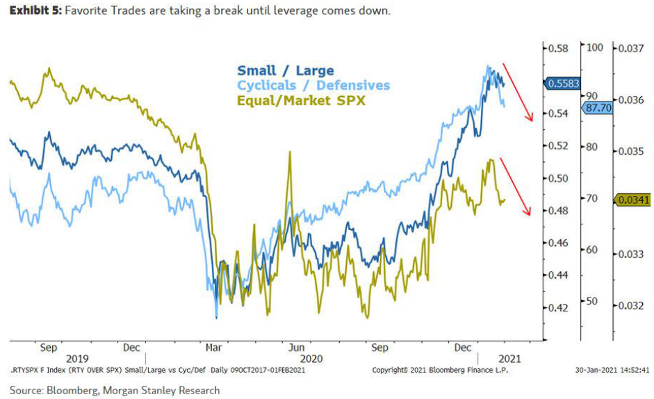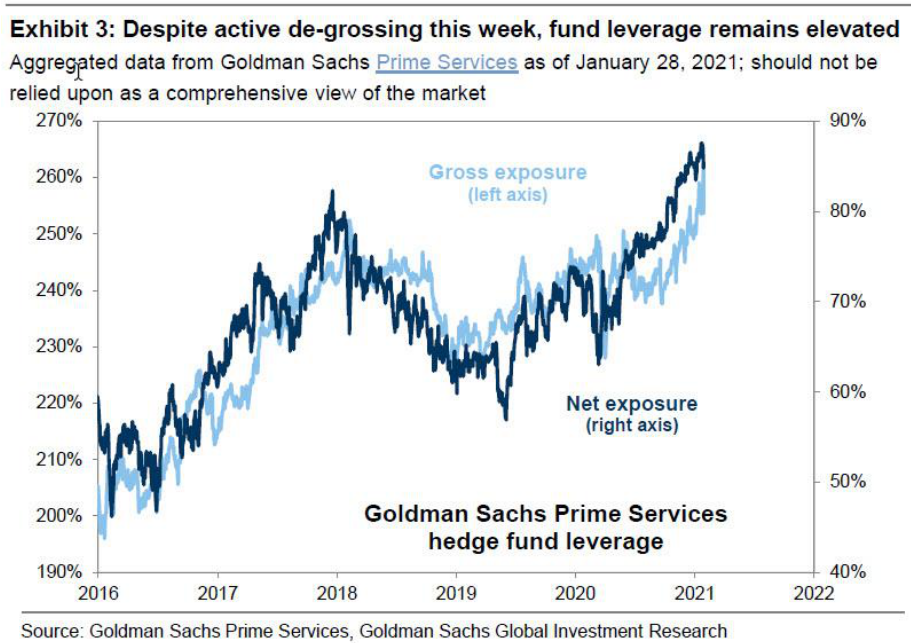 第三,散户激进的逼空策略是导火索。这些有针对性的挤压迫使对冲基金降低自身的杠杆,削减了总风险敞口。为应对挤压,对冲基金不得不进行空头回补,强制降低总杠杆率,也导致了多头敞口和净杠杆率的减少。股票抛售导致主要美股股指下跌了3%至5%,许多股票价格跌幅逾10%。