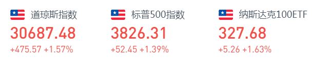 周二道指涨475.57点,或1.57%,报30687.48点;纳指涨209.38点,或1.56%,报13612.78点;标普500指数涨52.45点,或1.39%,报3826.31点。