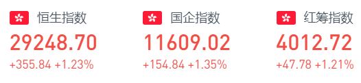 周二恒生指数涨1.23%,报29248.7点;国企指数涨1.35%,红筹指数涨1.21%。