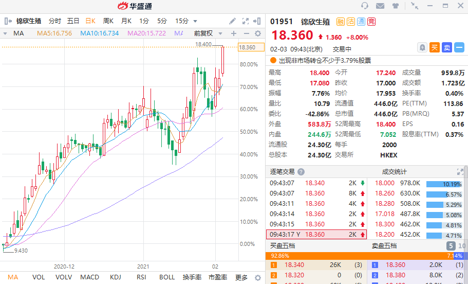 华盛资讯2月3日消息,锦欣生殖早盘高开高走,盘中最高见18.4港元,突破历史新高。截至发稿锦欣生殖涨8%,现报18.36港元每股,当前成交额达1.723亿,总市值为446亿港元。