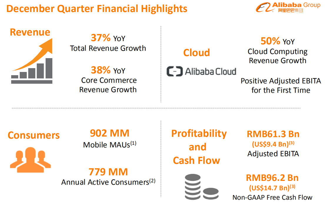 在2月2日,阿里巴巴公布了最新的截至2020年12月底的季度业绩,总体数据表现亮眼,具体如下: