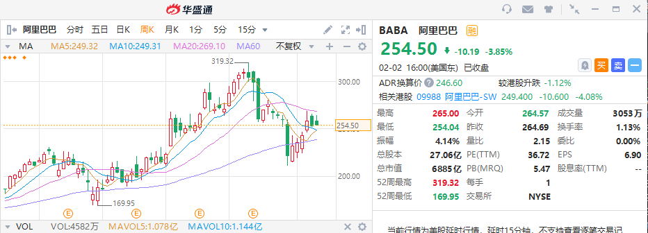 而在2月3日港股盘中,阿里巴巴-SW也呈现低开低走的股价表现,截至中午收市跌幅为3.85%,股价为250港元。