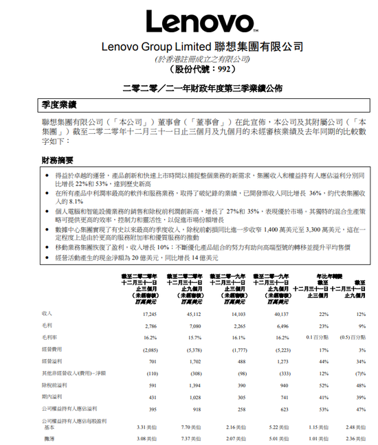 联想集团在港交所公告称,去年四季度净利润3.95亿美元,同比增长53%;收入172.45亿美元,同比增长22%,双双创历史新高。