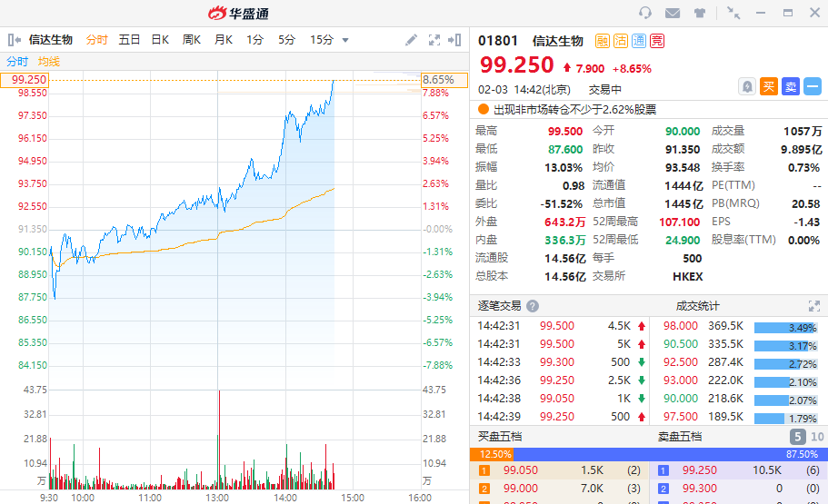 华盛证券2月3日消息,信达生物(01801)盘中异动,直线飙升近9%。截至发稿,信达生物涨8.65%,现报99.25港元每股,当前成交额达9.895亿港元,总市值为1445亿港元。