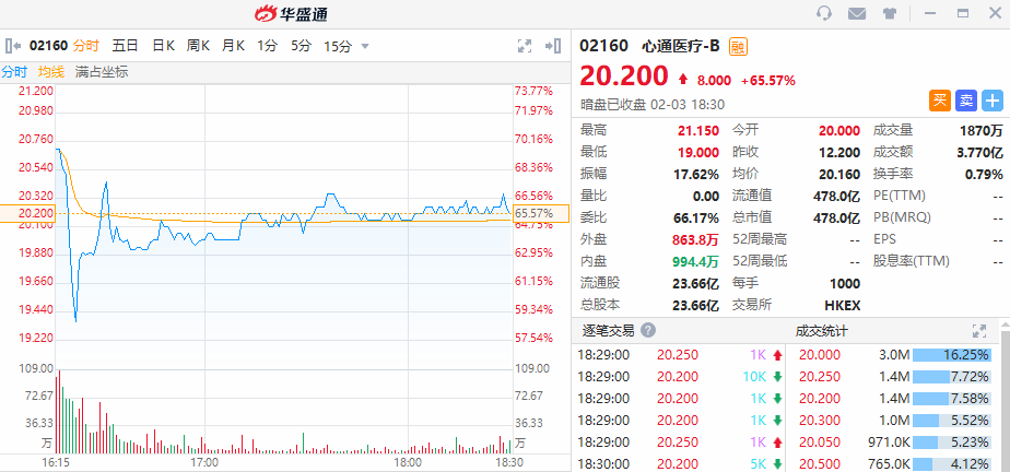 华盛资讯2月3日讯,心通医疗-B 暗盘收盘报价20.2港元,涨幅为65.57%,一手账面盈利8000港元。暗盘成交额3.77亿港元,市值为478亿港元,该股将于明日正式上市。