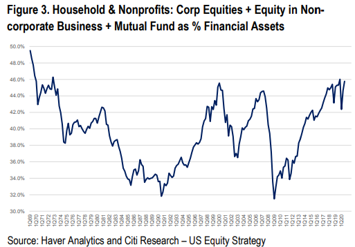 花旗称,很多人认为,如今的美股市场,更多的是由于低利率环境而带来的上涨。但是花旗也指出,美国居民在股票上的资产配置已经达到了50年来的高点。