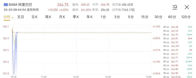 华盛资讯2月3日消息,阿里巴巴(BABA)开盘涨超4%。截至发稿,阿里涨4.03%,现报264.75美元,当前总市值重回7100亿美元之上。