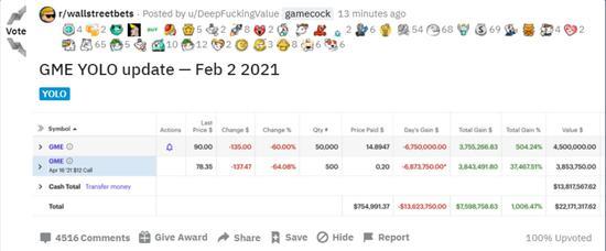 Gill六个月前就开始在YouTube上宣传GameStop,并向他的订阅用户解释,100%以上的品牌空头权益是如何对他们有利的。而在Reddit的WSB论坛上,他已经发布了他GameStop收益的截图一年多了,他称之为“GME YOLO更新(你只活一次)”。