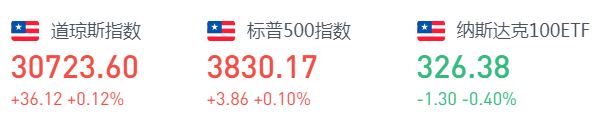 周三道指涨36.12点,或0.12%,报30723.60点;纳指涨2.23点,或0.02%,报13610.54点;标普500指数涨3.86点,或0.10%,报3830.17点。