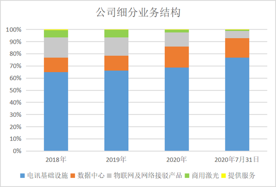 在下游客户方面,2020年4-7月,公司对中兴通讯的销售额猛增,实现了3.15亿的销售额,占当期营收的41.5%,相比2020财年17.5%的营收占比,上升了不少。公司对烽火通信的销售额有所下滑,部分原因是疫情爆发期烽火通信暂停了武汉地区的业务,但依然是公司的第二大客户,占7.9%的销售额。
