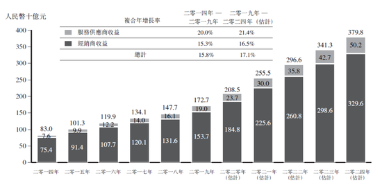 中国电讯及数据通讯接驳产品分销市场呈现加速扩张的趋势。据沙利文数据,2014-2019年中国电讯及数据通讯接驳产品分销的市场规模从830亿元增至1727亿元,年复合增速15.8%,在接下来的五年内,会有更高的年复合增速,估计为17.1%,2024年将达到3798亿元。
