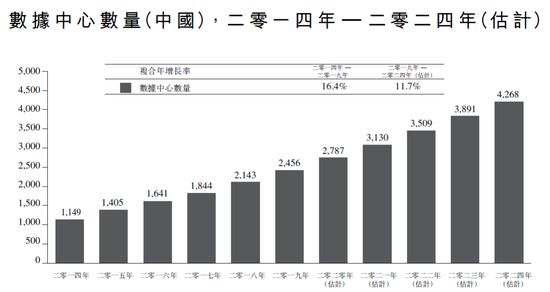 数据中心数量的增加使得数据中心光模块有了较大的需求。据沙利文数据,2014-2019年,我国数据中心的数量由1,149增至2,456,复合年增长率为16.4%。预计2024年,数据中心的数量将达到4,268,2019-2024年复合增长率为11.7%。