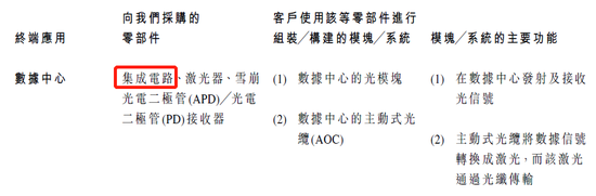 举几个例子,(1)在电讯基础设施方面,客户购买集成电路、接收器、变送器等零件构建基站及小蜂窝,使其提供无线服务,或者组装光学发射器,用来发送或接受光信号。(2)在数据中心方面,客户购买集成电路、激光器等零件构建数据中心光模块,用来发射或接受光信号。(3)在物联网方面,客户购买放大器、交换机、前端模块等零件组装WiFi系统、Zigbee系统、5G系统等,零件用作对应系统的信号发射及接受。