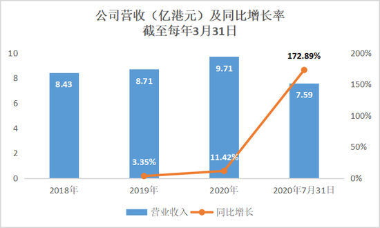 环联连讯在2018-2020财年的营收分别为8.43亿港元、8.71亿港元、9.71亿港元,增速有所提升,值得注意的是,在2020年4-7月的四个月内,公司实现了7.59亿的营收,同比增长172.89%,增幅较大。