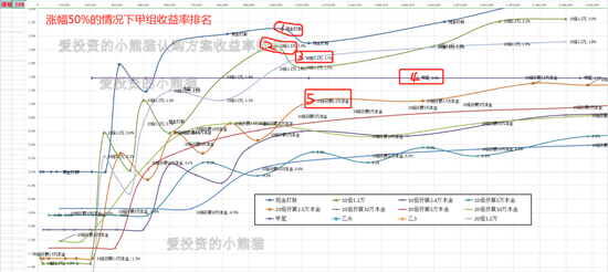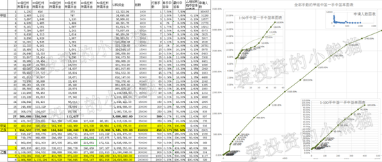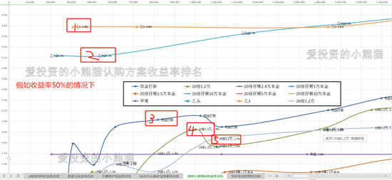 从上面这张收益率排名的曲线图形来看,横轴是资金量,纵轴是收益率。在甲组认购方案中,现金认购一手的方案排名是第一,不过紧跟其后的就是10倍融资和20倍融资的1.2万本金的方案,也就是我们经常说的小甲组融资。小甲组的融资这个和现金认购一手的方案的收益率差距比较小,在目前很多新股认购的情况下,这个方案也都比较吃香的,从京东健康开始就一直如此,京东健康,泡泡玛特,包括医渡科技,这些票配售结果分析来看,全都是小甲组占优势。