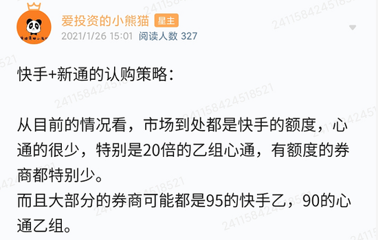 反观前面的,医渡科技甲组超购500倍,乙组超购2719倍,这个差值应该是历史罕见的了,医渡科技3.75万乙组也是新高,好在心通医疗这次乙组只有12,000人,估计主要原因还是因为大部分券商没有放心通的额度,全部都把额度给快手了,这样的人少的感觉瞬间觉得空气都变新鲜了。